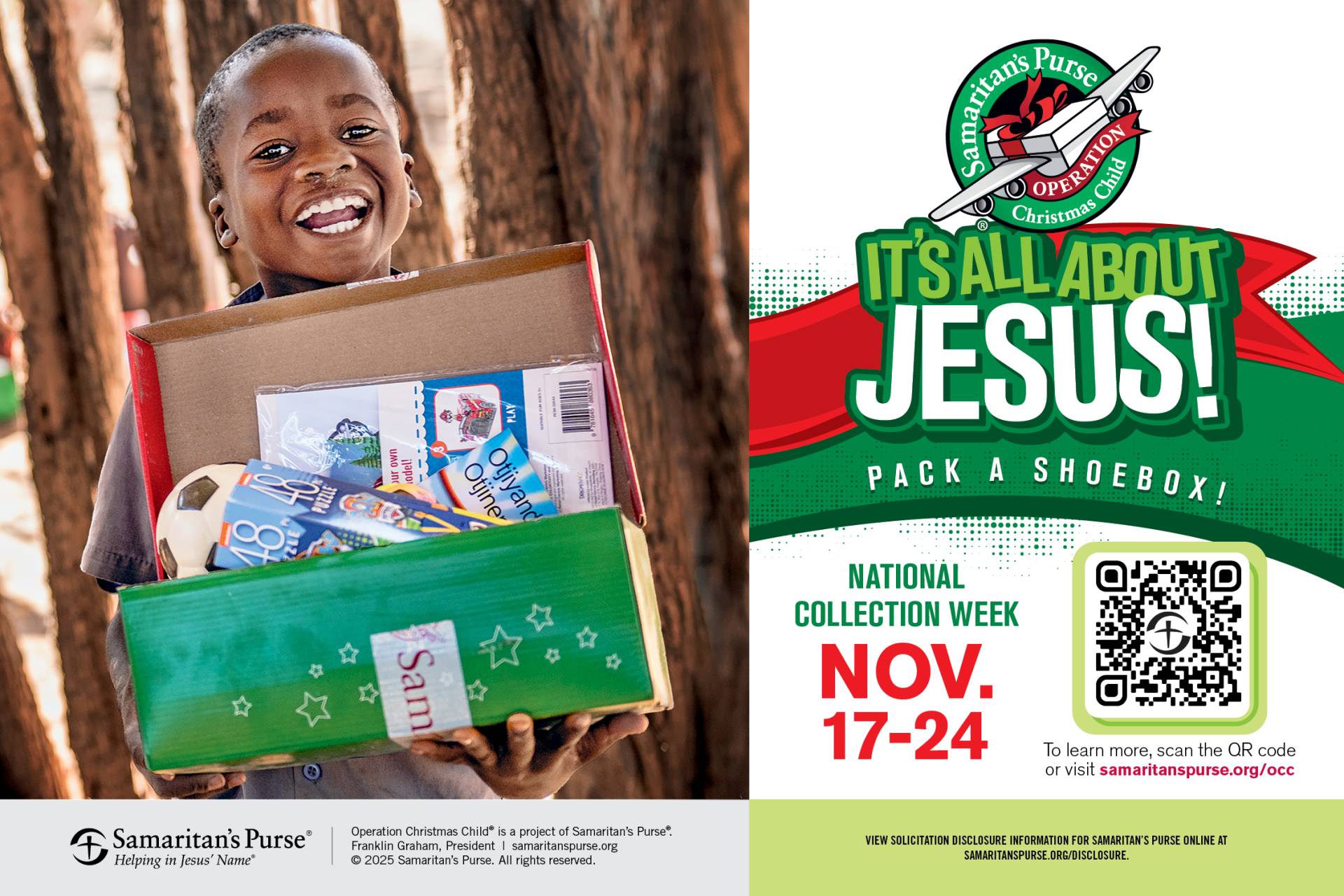 The 2025 Collection date is Sunday, November 24. The cost of shipping is $10. PLEASE include in your box. We have boxes, labels and what-to-pack sheets in the foyer. For more information go to www.samaritanspurse.org!